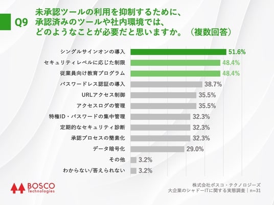 Q8で「わからない/答えられない」以外を回答した方に、「Q9.未承認ツールの利用を抑制するために、承認済みのツールや社内環境では、どのようなことが必要だと思いますか。(複数回答)」(n=31)と質問したところ、「シングルサインオンの導入」が51.6%、「セキュリティレベルに応じた制限」が48.4%、「従業員向け教育プログラム」が48.4%という回答となりました。