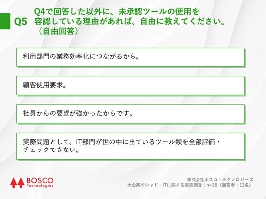 Q4で「わからない/答えられない」以外を回答した方に、「Q5.Q4で回答した以外に、未承認ツールの使用を容認している理由があれば、自由に教えてください。(自由回答)」(n=30)と質問したところ、「利用部門の業務効率化につながるから」や「社員からの要望が強かったからです」など13の回答を得ることができました。