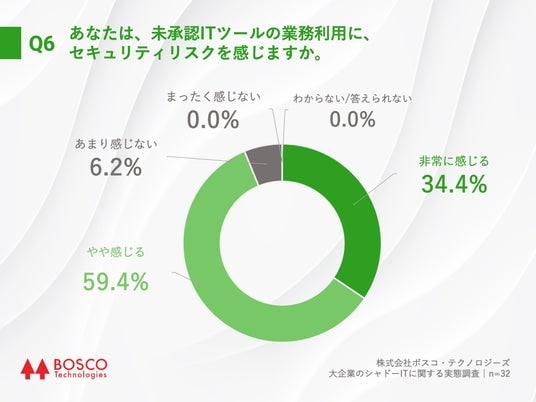 Q1で「はい」と回答した方に、「Q6.あなたは、未承認ITツールの業務利用に、セキュリティリスクを感じますか。」(n=32)と質問したところ、「非常に感じる」が34.4%、「やや感じる」が59.4%という回答となりました。