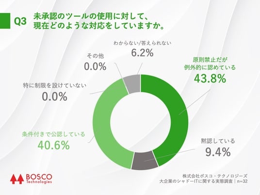 Q1で「はい」と回答した方に、「Q3.未承認のツールの使用に対して、現在どのような対応をしていますか。」(n=32)と質問したところ、「原則禁止だが例外的に認めている」が43.8%、「条件付きで公認している」が40.6%という回答となりました。