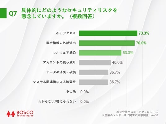 Q6で「非常に感じる」「やや感じる」と回答した方に、「Q7.具体的にどのようなセキュリティリスクを懸念していますか。(複数回答)」(n=30)と質問したところ、「不正アクセス」が73.3%、「機密情報の外部流出」が70.0%、「マルウェア感染」が53.3%という回答となりました。