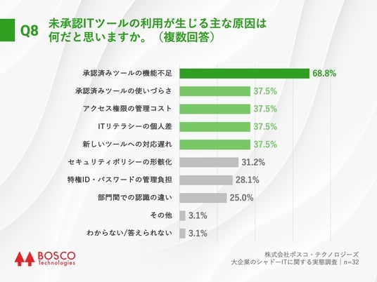 Q1で「はい」と回答した方に、「Q8.未承認ITツールの利用が生じる主な原因は何だと思いますか。(複数回答)」(n=32)と質問したところ、「承認済みツールの機能不足」が68.8%という回答となりました。