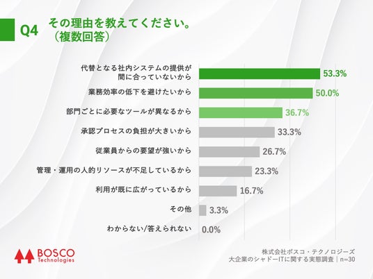 Q3で「わからない/答えられない」以外を回答した方に、「Q4.その理由を教えてください。(複数回答)」(n=30)と質問したところ、「代替となる社内システムの提供が間に合っていないから」が53.3%、「業務効率の低下を避けたいから」が50.0%、「部門ごとに必要なツールが異なるから」が36.7%という回答となりました。