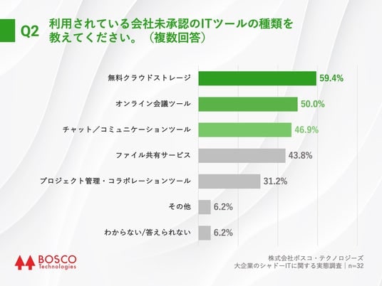 Q1で「はい」と回答した方に、「Q2.利用されている会社未承認のITツールの種類を教えてください。(複数回答)」(n=32)と質問したところ、「無料クラウドストレージ(例:Googleドライブ、Dropbox無料版)」が59.4%、「オンライン会議ツール(例:Zoom無料版、Google Meet)」が50.0%、「チャット/コミュニケーションツール(例:LINE、WhatsApp、Slack無料版)」が46.9%という回答となりました。