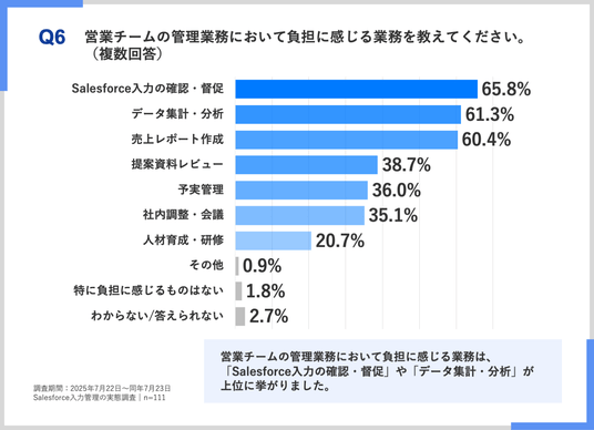 営業チームの管理業務において負担に感じる業務は、「Salesforce入力の確認・督促」や「データ集計・分析」が上位に