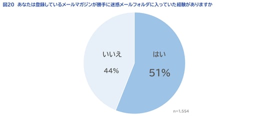 - 半数以上の人が、登録済みのメールマガジンが迷惑メールに分類された経験があると回答。読者に確実に届けるには、配信設定や認証を適切に設定することが求められる。