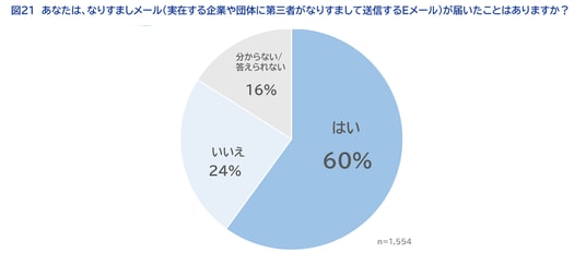なりすましメールが届いたことがある人は60%。「メッセージの内容」や「メールアドレス」から判断している人が多く、76%の人が開封せずに削除を実施。