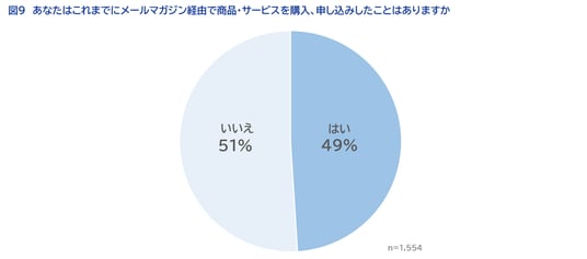 図9の「あなたはこれまでにメールマガジン経由で商品・サービスを購入、申し込みしたことはありますか」という質問に対して、49%の人が「はい」を選択しました。この結果から、メールマガジンは依然として多くの生活者の購買行動に影響を与える有効なチャネルであると考えられます。