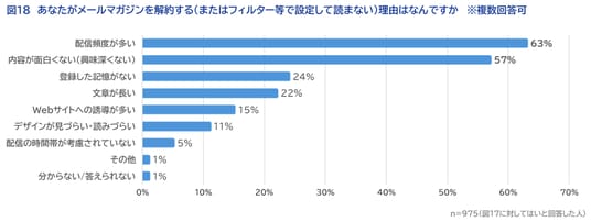 図17の質問で「はい」を選択した人に対して、「あなたがメールマガジンを解約する(またはフィルター等で設定して読まない)理由はなんですか」と質問したところ(図18)、「配信頻度が多い」(63%)、「内容が面白くない」(57%)が挙げられました。読者に継続して読んでもらうためには、配信の量を適切にコントロールするとともに、内容の質を高め、個々の関心に沿った発信が求められます。