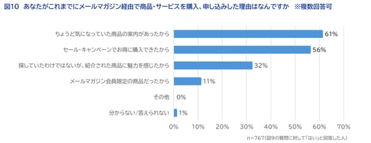 図9の質問で「はい」を選択した人に対して、「あなたがこれまでにメールマガジン経由で商品・サービスを購入、申し込みした理由はなんですか」という質問をしたところ(図10)、61%の人が「ちょうど気になっていた商品の案内があったから」を選択。「個人の興味・関心に合った訴求」が購入のきっかけになりやすいと考えられます。また、次いで56%の人が「セール・キャンペーンでお得に購入できたから」を選択していることから、お買い得情報と個別の関心を組み合わせた施策も有効と考えられます。例えば、ほしい物リストや閲覧履歴に連動したセール通知を送ることによりコンバージョンが上がることが期待できます。