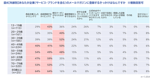 メールマガジンを登録するきっかけは「会員登録するタイミングで」と「商品を購入したタイミングで」が多い。世代が上がるほど、「商品を購入したタイミングで」を選択。