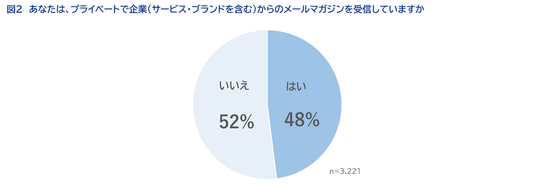 また、「あなたは、プライベートで企業(サービス・ブランドを含む)からのメールマガジンを受信していますか」という質問に対して「受信している」と回答した人は48%でした。