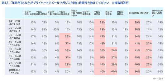 図12の回答を年齢別で見ると(図13)、多くの世代が平日の帰宅後や、休日の余暇・夜の時間帯、平日のお昼休憩中にメールを読むことが多いことがわかりました。また、50代以上では、休日の午前中もメールを読む人が他の年代より多い傾向です。