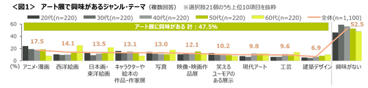 アート展に興味がある人は47.5%と約半数。興味があるジャンル・テーマは、「アニメ・漫画」が17.5%で最も多く、次いで「西洋絵画」(14.1%)、「日本画・東洋絵画」(13.5%)が続く。
