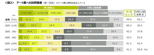 年に1回以上アート展へ行く人は44.4%。「1年に1回未満」は42.1%、「行ったことはない」は13.4%。