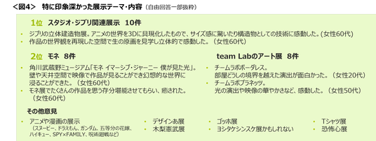 特に印象深かった展示の内容・テーマでは、「スタジオ・ジブリ」関連の展示が最も多くあがった。「モネ」は美術館での絵画の展示のほか、没入感のあるデジタルアートで強い印象を残している。<図4>