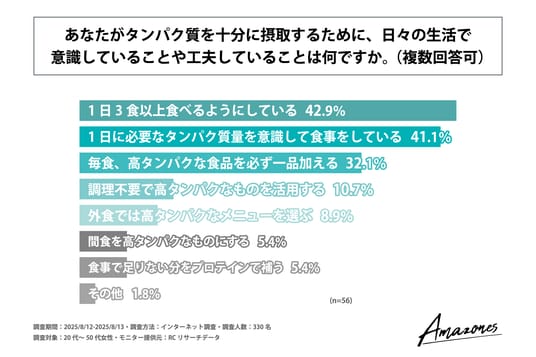 次に、"タンパク質"が十分に摂れていると回答した人を対象に「タンパク質を十分に摂取するために、日々の生活で意識していることや工夫していること」を尋ねる設問への回答では、1位が「1日3食以上食べるようにしている」で42.9%、2位が「1日に必要なタンパク質量を意識して食事をしている」で41.1%、3位が「毎食、高タンパクな食品を必ず一品加える」で32.1%という結果になりました。この結果から、タンパク質を十分に摂取するために、日々の生活で意識していることや工夫していることは主に「1日3食以上食べるようにすること」や「1日に必要なタンパク質量を意識して食事をすること」であることがわかりました。