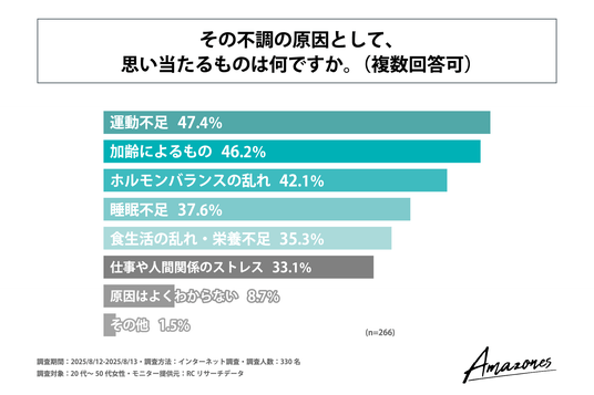 次に、日常生活で感じる身体や美容面の不調が何らかあると回答された方を対象に「不調の原因として、思い当たるもの」を尋ねる設問への回答では、1位が「運動不足」で47.4%、2位が「加齢によるもの」で46.2%、3位が「ホルモンバランスの乱れ」で42.1%という結果になりました。この結果から、不調の原因として、思い当たるもので最も多いのは「運動不足」であることがわかりました。