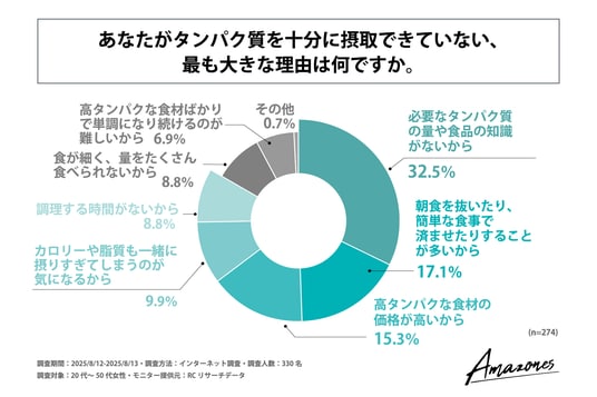 調査の最後、"タンパク質"が十分に摂れていない、または摂れているかわからないと回答した人を対象に「あなたがタンパク質を十分に摂取できていない、最も大きな理由」を尋ねる設問への回答では、1位が「必要なタンパク質の量や食品の知識がないから」で32.5%、2位が「朝食を抜いたり、簡単な食事で済ませたりすることが多いから」で17.1%、3位が「高タンパクな食材の価格が高いから」で15.3%という結果になりました。この結果から、タンパク質を十分に摂取できていない、または摂取できているかわからない人の最大の理由は「必要なタンパク質の量や食品の知識がないから」であることが明らかになりました。