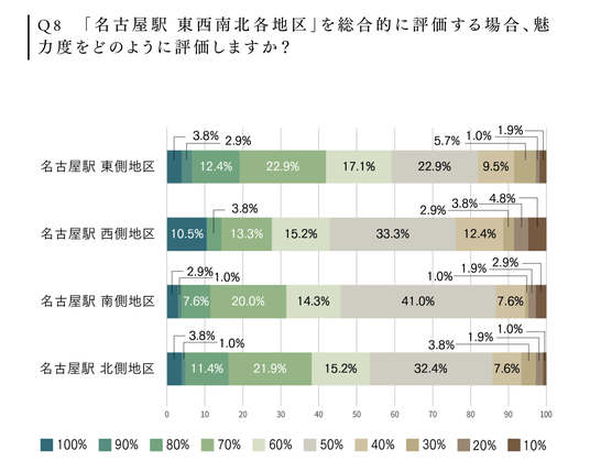 東側地区は、全体の8割以上が「魅力度50%以上」と高評価を維持。さらに「魅力度70%以上」も4割を超えており、名古屋駅の玄関口として他地区を上回る水準となっています。