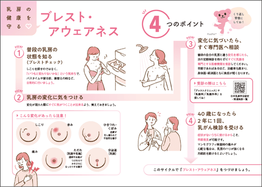 ピンクリボンフェスティバル運営委員会事務局(公益財団法人日本対がん協会ほか、以下「当会」)は厚生労働省の「がん予防重点健康教育及びがん検診実施のための指針」の一部改正(2021年10月適用)に伴い、 「ブレスト・アウェアネス」の普及を強化することを目的に全国の自治体で配布している啓発冊子「ブレスト・アウェアネス ブック」(以下、「啓発冊子」)を2025年改訂し、ピンクリボン月間となる10月1日から約3万部を全国の連携自治体などにて配布します。