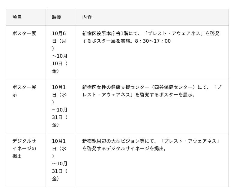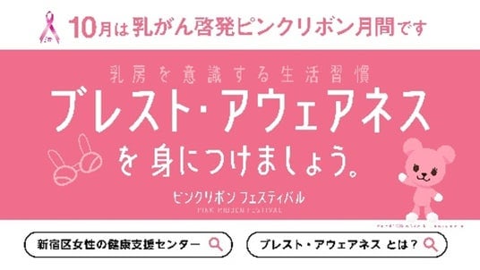 今年も「ブレスト・アウェアネス」の啓発に注力しており、東京都・葛飾区・江東区・渋谷区・新宿区・中央区・横浜市等で「ブレスト・アウェアネス」を啓発するパネル展示を実施する他、渋谷区・新宿区では啓発動画を駅周辺のデジタルサイネージにて掲出予定です。また、葛飾区では、新小岩駅北口駅前広場内のモンチッチ銅像にピンクリボンのメッセージを発信する装飾が施されます。