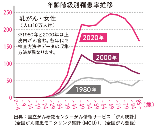 日本人女性の乳がんは、45歳から49歳ごろと、60歳から79歳ごろの二つの年代で特に多く見られます。また、乳がんと診断される女性は年々増えており、現在では女性の約9人に1人が乳がんになります。日本人女性の乳がん増加には、食生活の欧米化、飲酒・喫煙、出産数の減少や出産年齢の上昇、さらに閉経後の肥満など、生活習慣や価値観の変化が大きく関わっています。