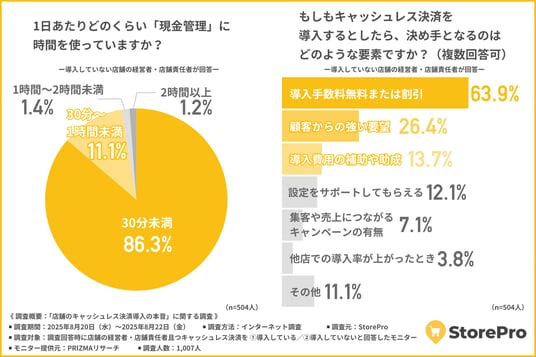 StorePro(所在地:東京都港区)は、店舗の経営者・店舗責任者且つキャッシュレス決済を1.導入している/2.導入していない方を対象に、「店舗のキャッシュレス決済導入の本音」に関する調査を行いました。