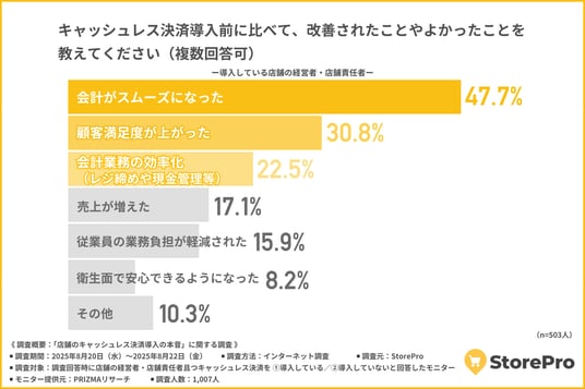 「導入後に改善されたことやよかったこと」について尋ねたところ、『会計がスムーズになった(47.7%)』が最も多く、次いで『顧客満足度が上がった(30.8%)』『会計業務の効率化(レジ締めや現金管理等)(22.5%)』と続きました。