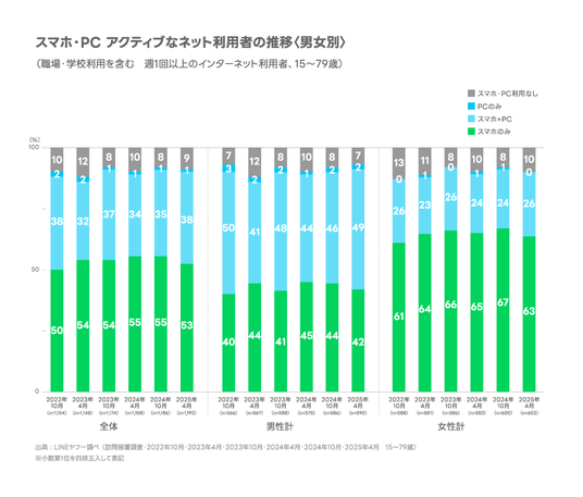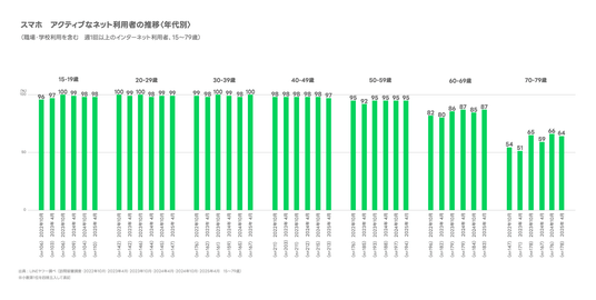 LINEヤフーでは、インターネットのコミュニケーションプラットフォームの一翼を担う会社の責務として、よりよいサービス提供のためにさまざまな調査研究を行っています。その一環として、2016年4月より半期に一度スマートフォン等でのインターネット利用に関する定点調査を実施しています。このたび、2025年上期(4月)の調査結果をお知らせします。
