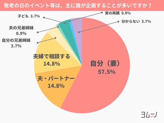 敬老の日の贈り物やイベントについて、「自分(妻)」が企画するという方が、57.5%と過半数を超えました。「夫・パートナー」「夫婦で相談する」と回答した方はともに14.8%と少数派です。