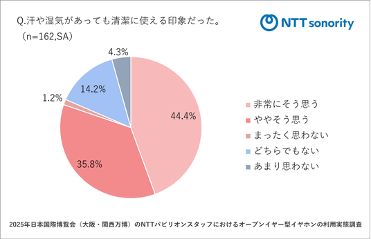 ■92.6%のスタッフが「耳蒸れや熱ごもりの軽減」を感じ、さらに、80.2%が「汗や湿気があっても清潔に使える印象がある」と回答。また、82.7%が「夏場や屋外での勤務でも快適さが保たれた」と実感し、高温多湿な環境でも優れた快適性を提供できることが確認された。