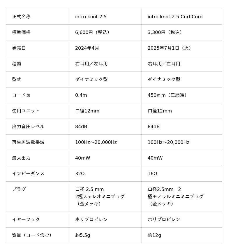 『intro knot 2.5 Curl-Cord』においては耐久性や装着感を向上させるため、伸縮性のあるカールコードを採用。また、断線しにくいストレートプラグも使用しています。さらに新開発のドライバーにより、音質や音圧も向上し、より高いパフォーマンスを提供します。