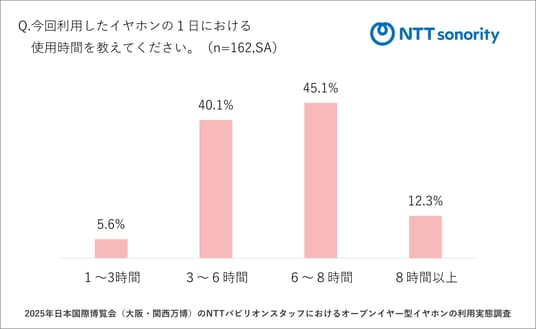 ■NTTパビリオンスタッフの45.1%が1日あたり6~8時間、12.3%のスタッフが8時間以上にわたりイヤホンを使用していることが確認された。