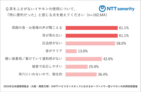 特に便利だった点として「周囲の音やお客様の声が聞こえる」「耳が蒸れない」がともに61.1%で最多。次いで「圧迫感がない」が58.0%となりました。
