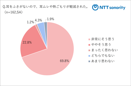 夏場の高温多湿な状況下での使用感について、92.6%が「耳をふさがないので、耳ムレや熱ごもりが軽減された」と回答。また、80.2%が「汗や湿気があっても清潔に使える印象があった」と感じていました。