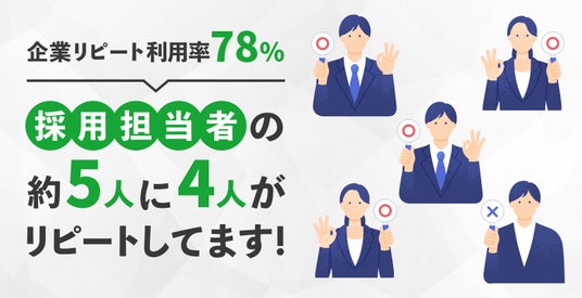 SOKUDANは、企業リピート率が78%という結果になりました(※)。約5社中4社という高い割合の企業様に継続してご利用いただいており、数多くのHR系サービスがある中で、初回のみの取引に留まらず、多くの企業様から継続的にお声がけをいただける高い満足度のサービスとなっております。