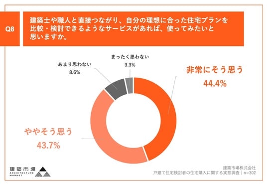 「Q8.建築士や職人と直接つながり、自分の理想に合った住宅プランを比較・検討できるようなサービスがあれば、使ってみたいと思いますか。」(n=302)と質問したところ、「非常にそう思う」が44.4%、「ややそう思う」が43.7%という回答となりました。