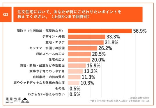 Q1で「注文住宅」と回答した方に、「Q3.注文住宅において、あなたが特にこだわりたいポイントを教えてください。(上位3つまで回答可)」(n=195)と質問したところ、「間取り(生活動線・部屋数など):が56.9%、「デザイン・外観:が33.3%、「立地・エリア」が31.8%という回答となりました。