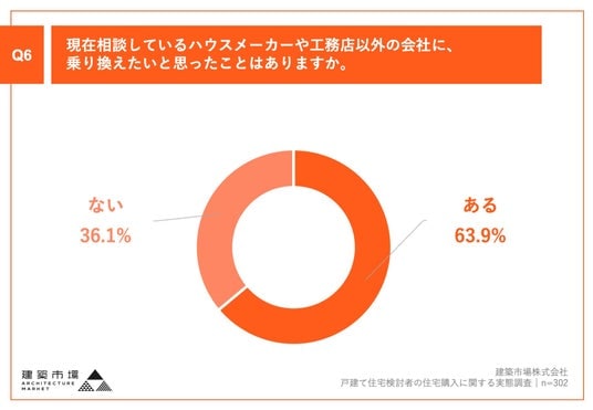 「Q6.現在相談しているハウスメーカーや工務店以外の会社に、乗り換えたいと思ったことはありますか。」(n=302)と質問したところ、「ある」が63.9%、「ない」が36.1%という回答となりました。