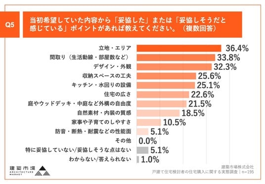 Q1で「注文住宅」と回答した方に、「Q5.当初希望していた内容から「妥協した」または「妥協しそうだと感じている」ポイントがあれば教えてください。(複数回答)」(n=195)と質問したところ、「立地・エリア」が36.4%、「間取り(生活動線・部屋数など)」が33.8%、「デザイン・外観」が32.3%という回答となりました。