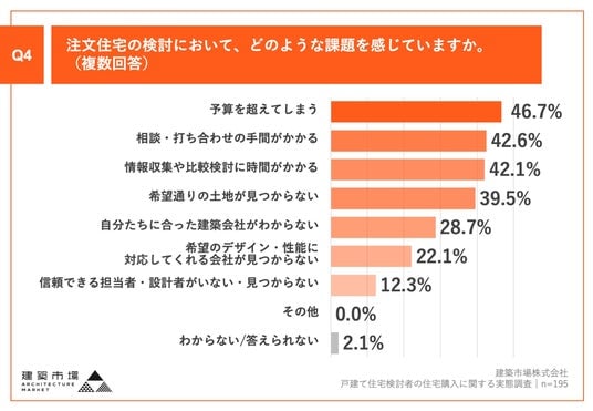 Q1で「注文住宅」と回答した方に、「Q4.注文住宅の検討において、どのような課題を感じていますか。(複数回答)」(n=195)と質問したところ、「予算を超えてしまう」が46.7%、「相談・打ち合わせの手間がかかる」が42.6%、「情報収集や比較検討に時間がかかる」が42.1%という回答となりました。