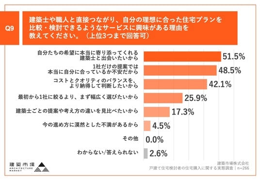 Q8で「非常にそう思う」「ややそう思う」と回答した方に、「Q9.建築士や職人と直接つながり、自分の理想に合った住宅プランを比較・検討できるようなサービスに興味がある理由を教えてください。(上位3つまで回答可)」(n=266)と質問したところ、「自分たちの希望に本当に寄り添ってくれる建築士と出会いたいから」が51.5%、「1社だけの提案では本当に自分に合っているか不安だから」が48.5%、「コストとクオリティのバランスを、より納得して判断したいから」が42.1%という回答となりました。