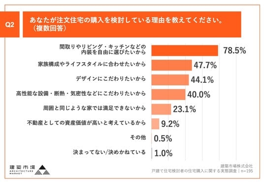 Q1で「注文住宅」と回答した方に、「Q2.あなたが注文住宅の購入を検討している理由を教えてください。(複数回答)」(n=195)と質問したところ、「間取りやリビング・キッチンなどの内装を自由に選びたいから」が78.5%、「家族構成やライフスタイルに合わせたいから」が47.7%という回答となりました。