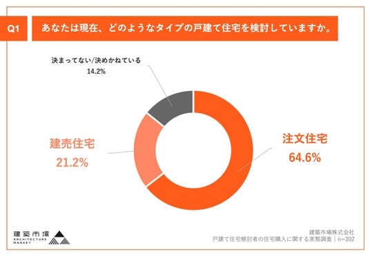 「Q1.あなたは現在、どのようなタイプの戸建て住宅を検討していますか。」(n=302)と質問したところ、「注文住宅(自分たちの希望に沿って建築する住宅)」が64.6%、「建売住宅(すでに完成済み、もしくは間取りが決まっている住宅)」が21.2%という回答となりました。