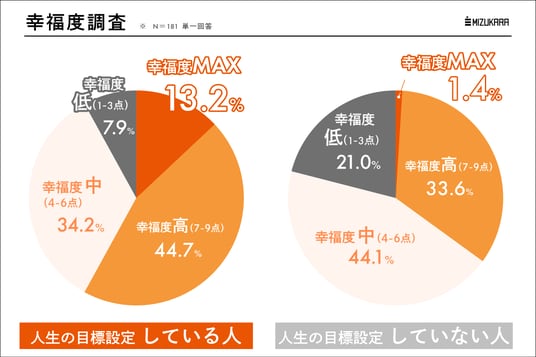 認知科学に基づくコーチングを法人・個人に提供する株式会社ミズカラ(本社:東京都千代田区、代表取締役 山宮健太朗)は、このたび25歳~59歳の働く男女500名を対象とした「仕事・人生の目標設定と幸福度の相関」に関する意識・実態調査を行いました。