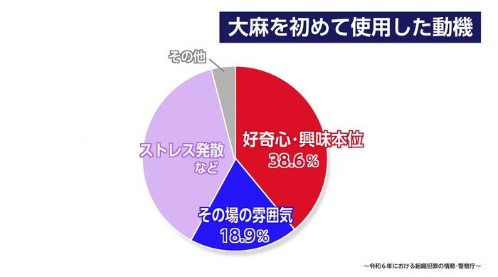 警察庁の調査によると、大麻を初めて使用した動機は「好奇心・興味本位」が最も多く、次いで「その場の雰囲気」で、この2つで約6割を占める。