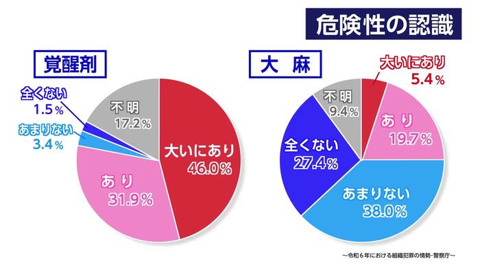 覚醒剤と大麻の危険性の認識の違いを比較すると、覚醒剤は「大いにあり」「あり」と回答した人が約8割だったのに対し、大麻は約2割にとどまった。