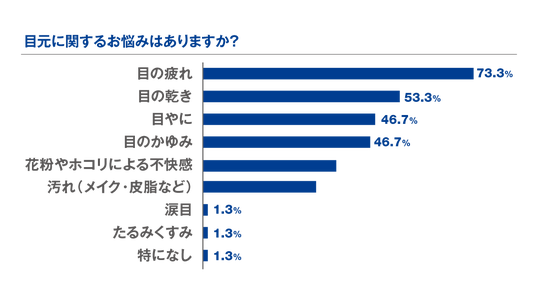55歳以上の男女 75名を対象とした新たな調査によると、日本の55歳以上の消費者の99%が何らかの目の不快感を経験していることが明らかになりました。主な悩みは、疲れ目(73%)と乾燥(50%以上)であり、回答者のおよそ半数(45%)が、これらの悩みが日常生活に「大きな影響」を与えていると答えています。