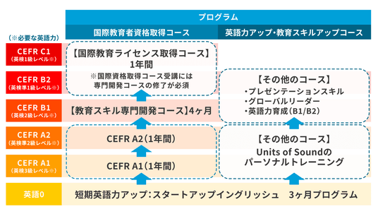 英語初心者でも、最終的にCEFR C1レベル(英検1級相当)の高度な英語力が身につき、グローバルな環境で自信を持って指導できます。